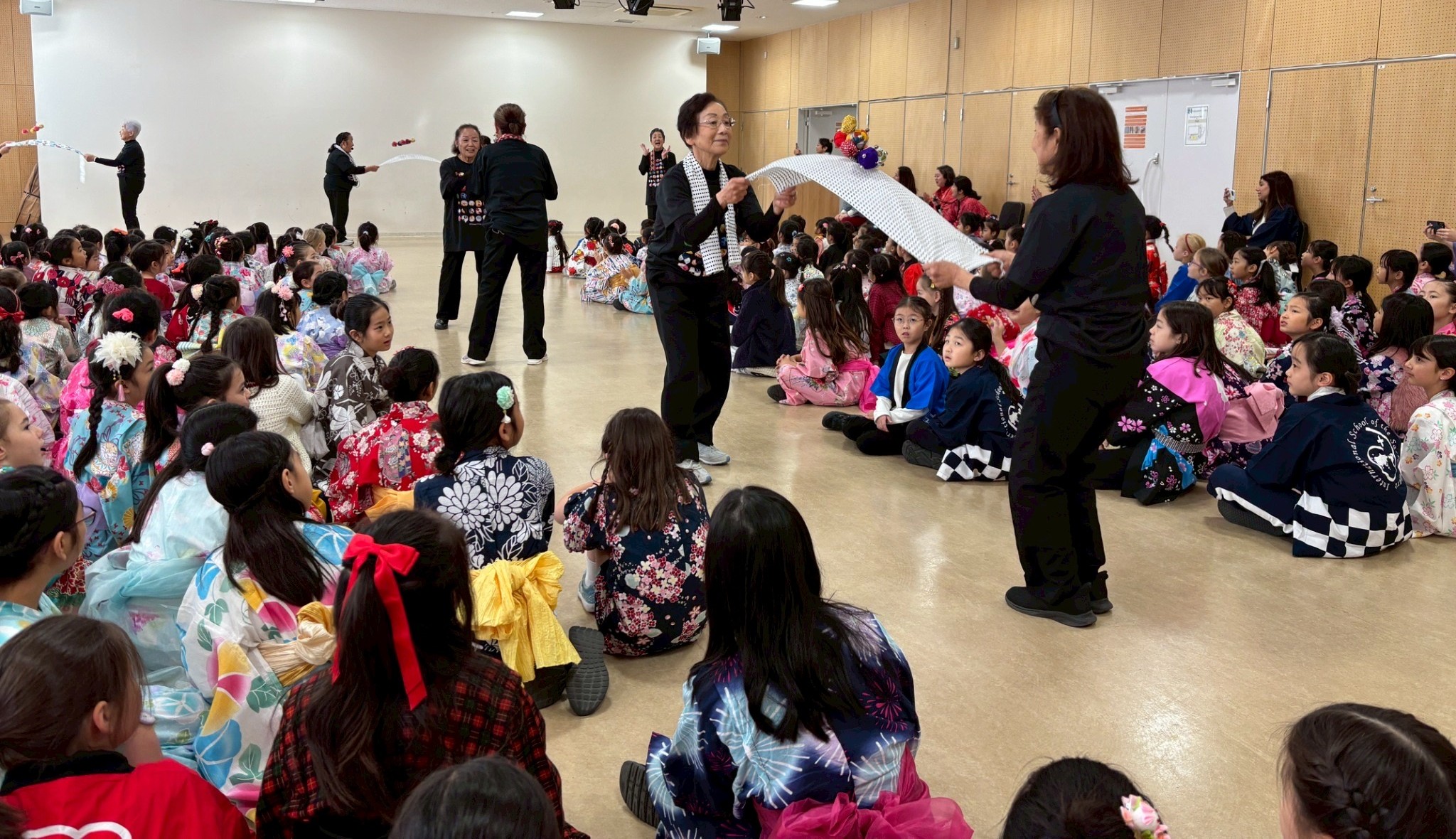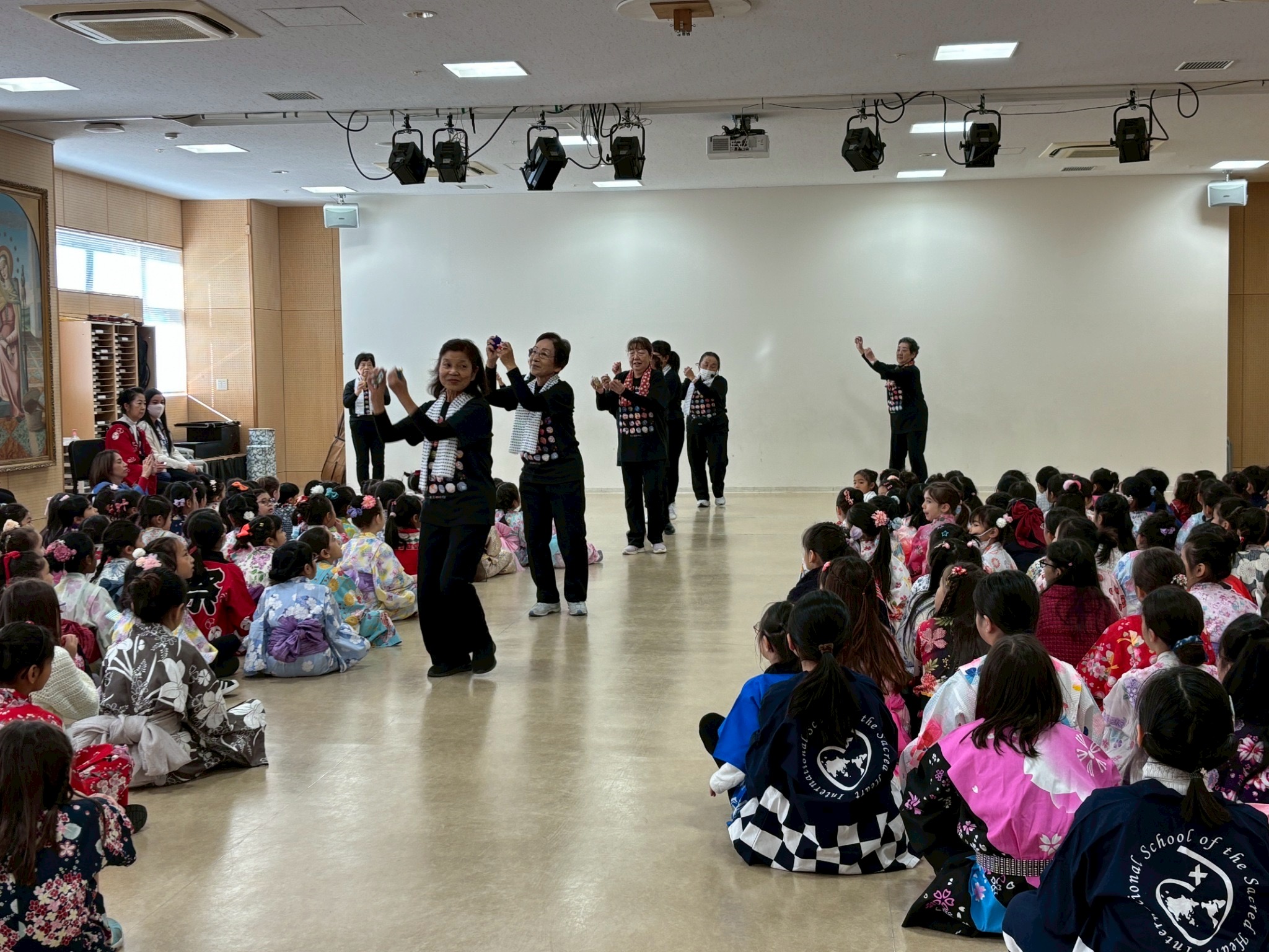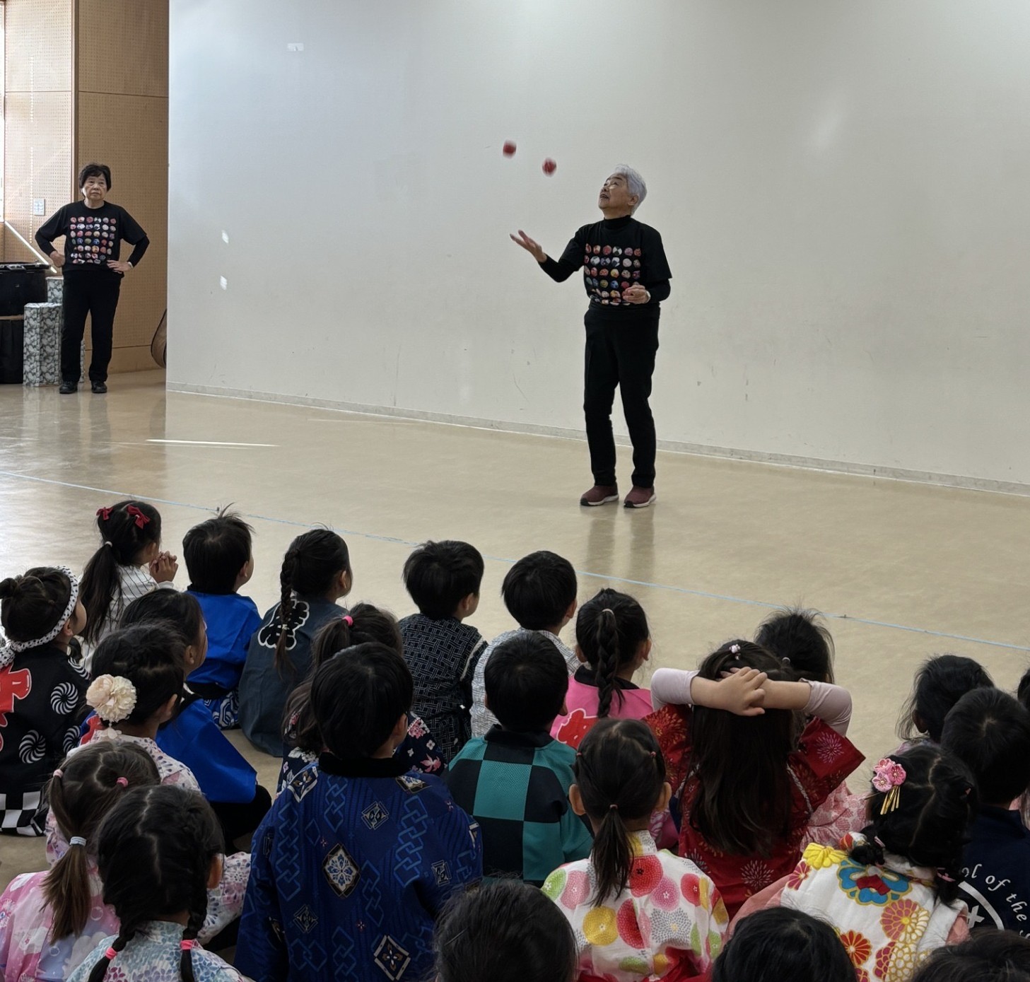 2025年11月21日、渋谷区広尾にある聖心インターナショナルスクールではジャパンデイとして、日本の伝統文化に触れ、多文化共生を学ぶ日としています。東京・おてだまのメンバーもこのイベントに招かれ、お手玉遊びを先生や生徒達と楽しみました。初めてお手玉に触れる子供達もいて、中身は何かと覗いたり、高く放り投げるなど、それぞれお手玉で遊んでいましたが、東京音頭にのせて私達が登場すると皆さん真剣に見入っていました。ジャグリングなどの技を披露すると歓声が上がりました。お手玉の遊び方の説明を受けた後、一人一人がチャレンジ、上手にできると満面の笑みが浮かびました。お手玉に国境はないと思いを一つにし、秋晴れの空の下、すがすがしい気持ちでスクールを後にしました。